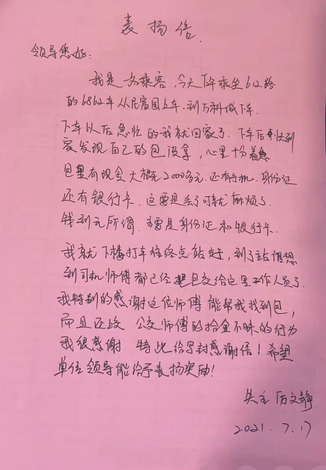 公交司機拾金不昧,失主致信感激萬分