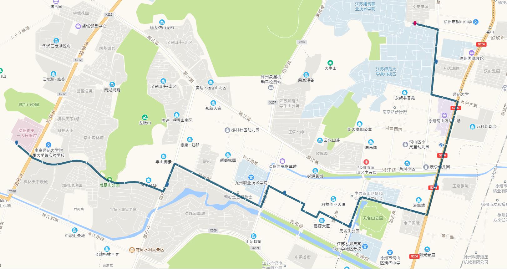 線路站點:建筑學(xué)院、江蘇師范大學(xué)、師范大學(xué)地鐵站、萬科新都會、港鑫城、南洋國際、康樂園南門、無名山公園地鐵站、銅山區(qū)政府、楚河金茂府、嵩山路、銅山新區(qū)總站、久隆鳳凰城北門、保利迎賓館、龍腰山公園、泉山森林海、第一人民醫(yī)院南門。