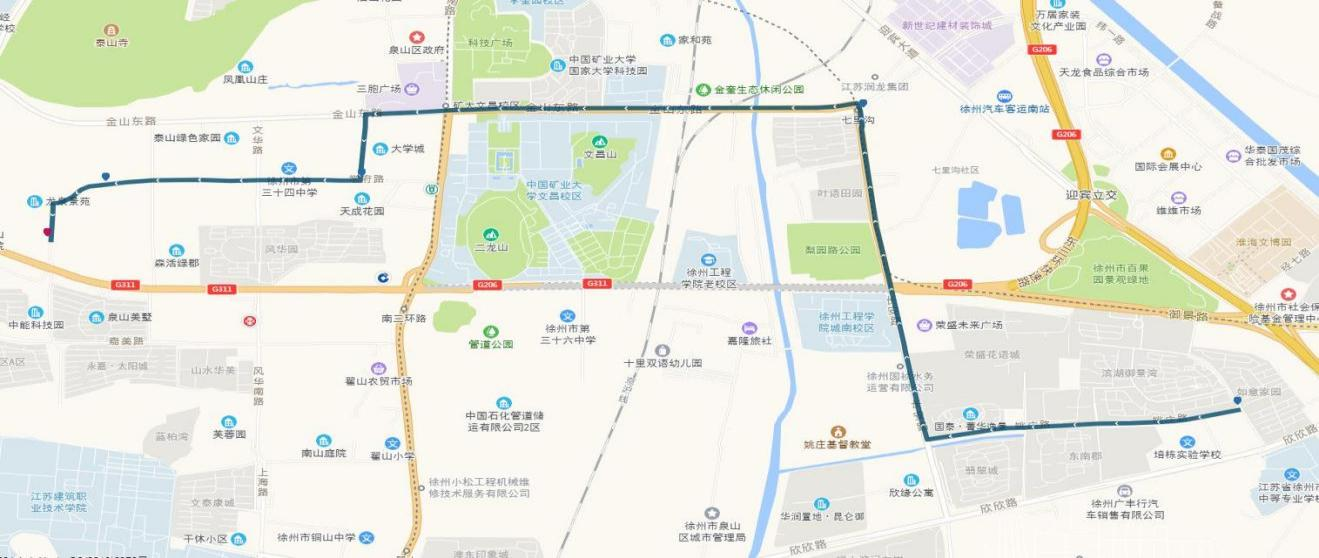 線路站點:御景灣公交首末站、濱湖御景灣南門、姚莊街坊中心、欣欣路口、七里溝地鐵站、礦大北門、大學(xué)城、天成花園、三十四中、三十中附小、泉泰嘉苑、泉山美墅西門(路西,單向)、碧水灣小區(qū)(路北、單向)、泉山法院(路南,單向)。備注:因目前雙山路與三環(huán)南路交叉口正在施工,公交車輛無法通行,319路暫時僅運行至泉泰嘉苑。待道路貫通后,進行全線路運營。