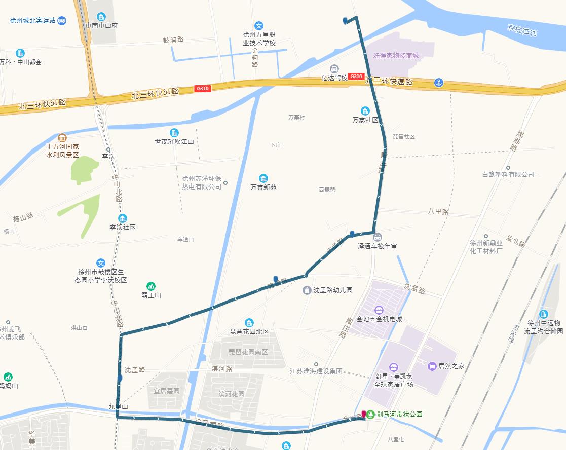線路站點:山南小鎮(zhèn),山水龍瑞,馬場湖路口,馬場湖,怡康花園,后勤學(xué)院北,誠坤鋼材市場,蘇堤北路立交橋(西),蘇堤北路立交橋(東),蘇堤路小學(xué),永業(yè)花園小區(qū),江蘇四監(jiān),銅沛路東口,中山北路立交橋