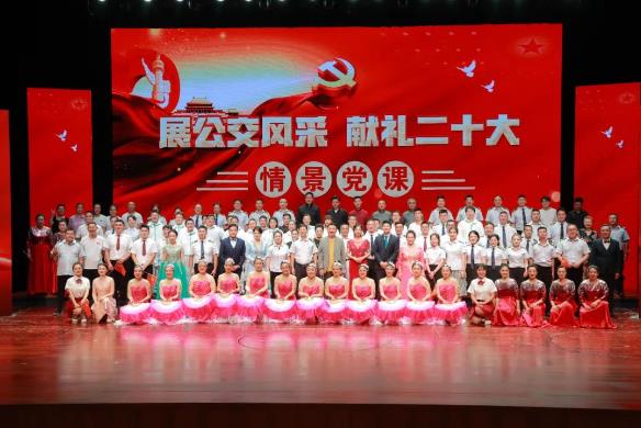 為激勵(lì)廣大黨員群眾以實(shí)際行動(dòng)迎接黨的二十大勝利召開,8月10日下午,徐州公交集團(tuán)成功舉辦“展公交風(fēng)采 獻(xiàn)禮二十大”情景黨課。市交控集團(tuán)黨委委員、紀(jì)委書記胡濤,市交通運(yùn)輸局宣傳教育處處長(zhǎng)高夫健,徐州廣播電視傳媒集團(tuán)總編室主任劉建玲,市公交集團(tuán)外部董事,市交控集團(tuán)黨建工作部、群眾工作部部門領(lǐng)導(dǎo),以及公交集團(tuán)黨委班子成員、先進(jìn)勞模、職工代表共450余人出席并觀看演出。