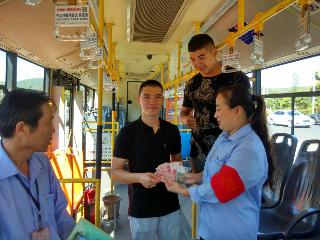 9月14日6點半左右,一位熱心市民在蘋果匯鄰灣站臺撿到一個文件袋交到游一路駕駛員張欣手中,文件袋內(nèi)裝有一本護(hù)照、一本學(xué)生證,人民幣4150元、美元450元。張欣把車輛駛?cè)氲V大南湖校區(qū)把文件袋交到夜間內(nèi)保人員手中并聯(lián)系車隊長說明情況。9月15日,游一線路長王景文在多方聯(lián)系下找到了失主,失主是一名烏茲別克斯坦留學(xué)生,在礦大上學(xué),拿回文件袋失主表示自己真是太幸運(yùn)了。