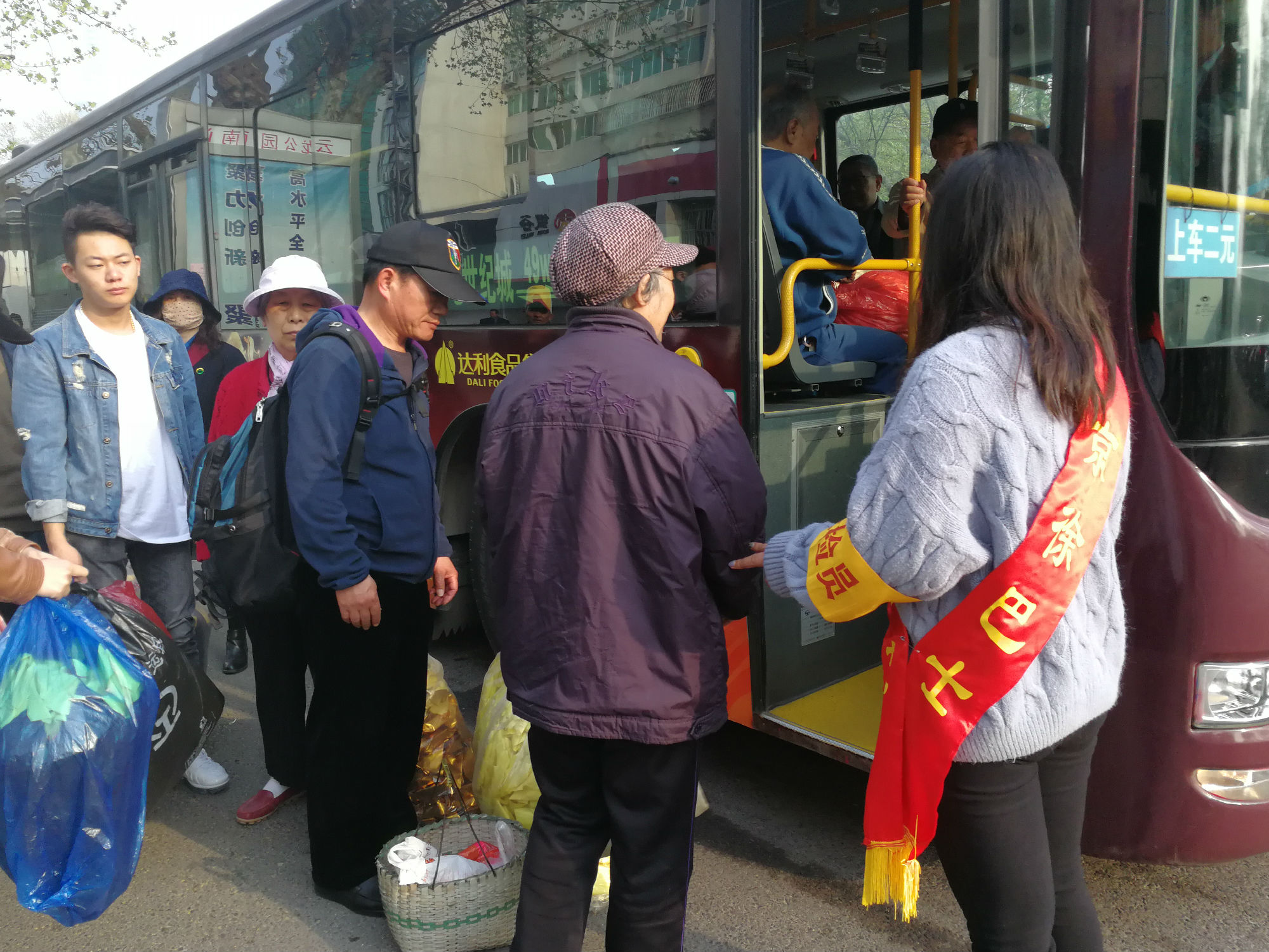 云龍公園南門,站滿了拿著大包小包的乘客?!按蠹遗藕藐?,注意安全,不要擁擠,需要換零錢的乘客可以到零幣兌換處換取零錢。”志愿者微笑著維持現(xiàn)場秩序。人群中有位提著兩個大包裹的大媽,志愿者走到大媽跟前,關(guān)切地詢問:“大媽,我來幫您把包裹拿上車吧。”志愿者一手?jǐn)v扶老人上車,一手拿著物品,為其安排好座位并叮囑大媽注意安全。一班車走后,還沒撈著喝口水,現(xiàn)場又聚滿了乘客,志愿者們又開始忙碌起來:“大爺,車還要一會才能來,您先坐這歇一會吧?!敝驹刚吣脕戆宓?,讓老大爺坐下休息,老大爺十感動,說道:“你們真貼心。